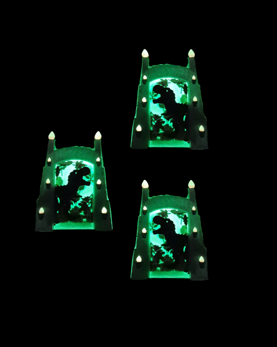 The glowing backdrop and lanterns create a prehistoric ambiance, while the shaker paper leaves inside add a touch of whimsy.