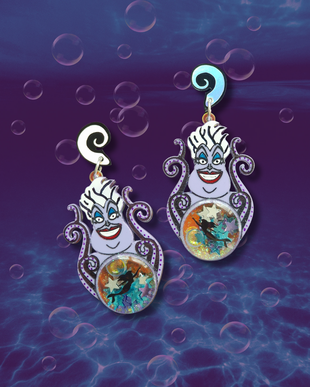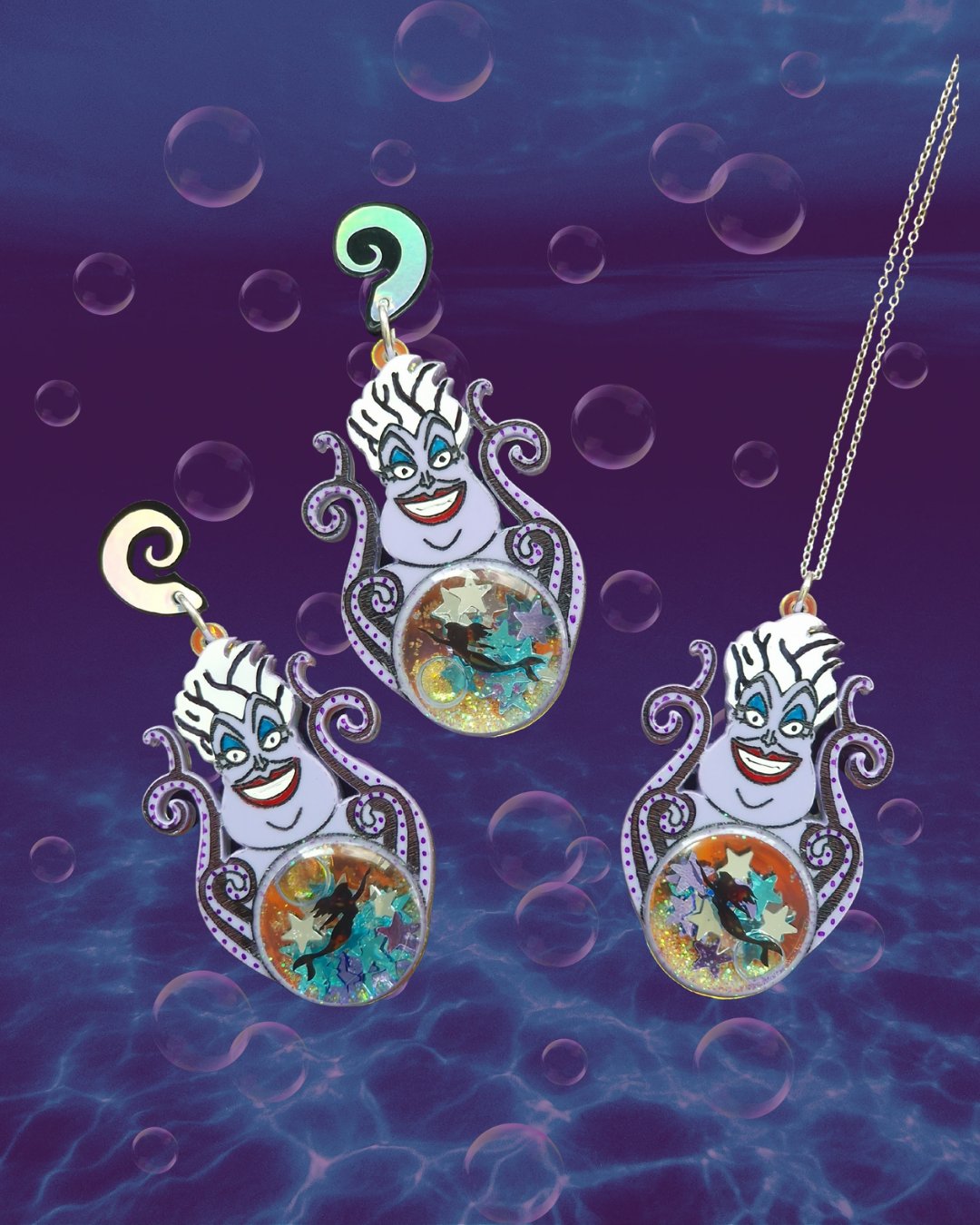 These limited edition sea witch designs are packed with intricate details, featuring iridescent crystal ball accents that double as glitter liquid shakers.