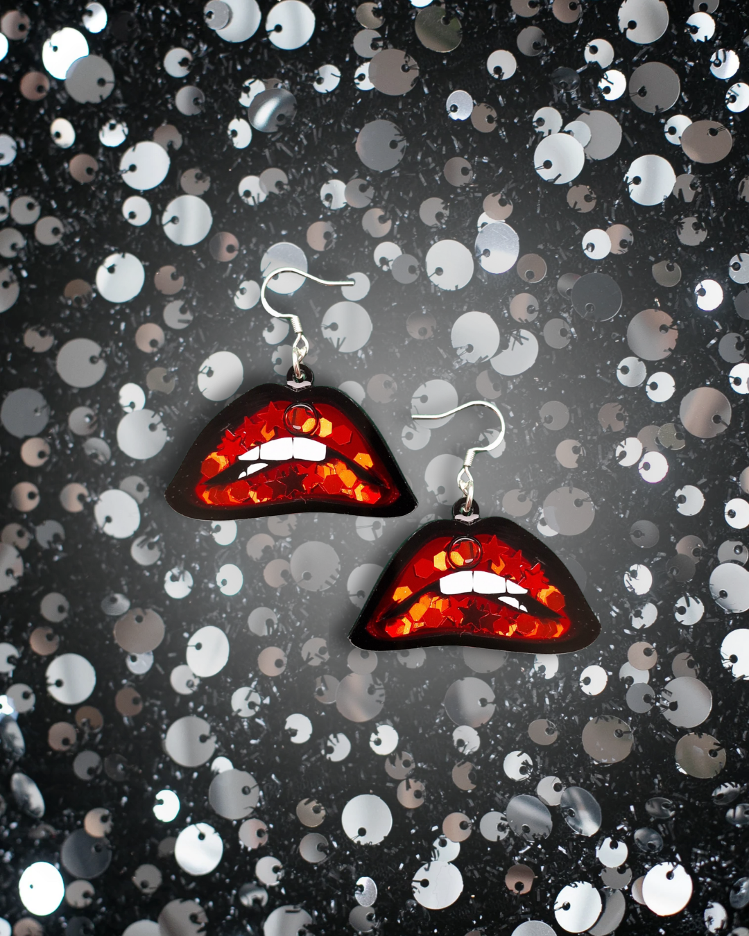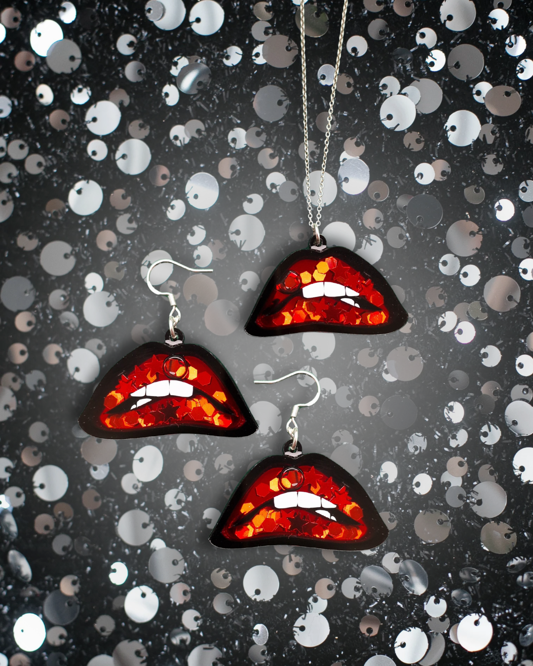 These unique pieces features a liquid shaker filled with glitter, adding a touch of sparkle to your spooky ensemble. Perfect for fans of the cult classic, this jewellery is a must-have for any Rocky Horror lover.
